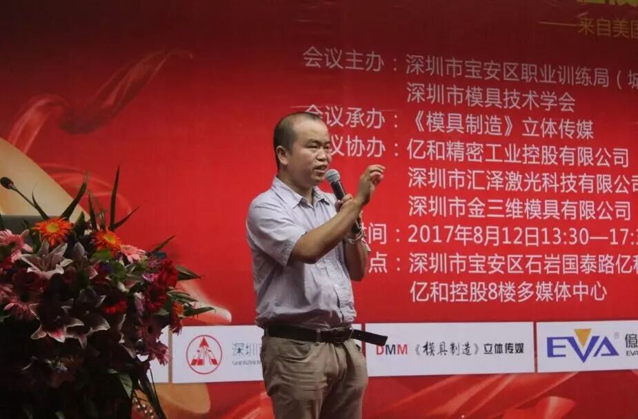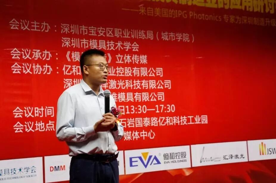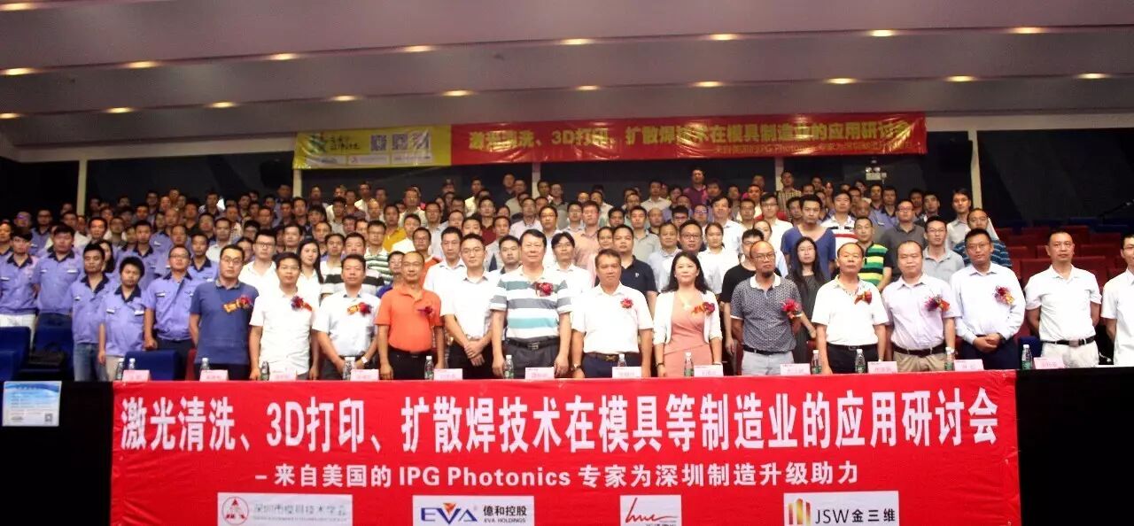2017年8月12日,以“激光清洗、3D打印、扩散焊技术在模具制造业的应用”为主题的研讨会在深圳市石岩国泰路亿和科技工业园成功召开。本次研讨会是由深圳市模具技术学会、深圳市宝安区职业训练局(城市学院)主办,《模具制造》杂志社承办,亿和精密工业控股有限公司、深圳市汇泽激光科技有限公司、深圳市金三维模具有限公司协办。会议的主讲嘉宾有来自IPG Photonics激光器应用专家林松先生、EOS大中华区模具市场经理吴怀安先生、陕西智拓固相增材制造公司深圳分公司总经理马哲先生。深圳市模具技术学会会长谭超武先生、深圳市政协常委、深圳市机械行业协会会长、亿和精密工业控股有限公司总裁张耀华先生、宝安区职业训练局(城市学院)王凌云副局长先后致辞。参加会议的企业有亿和精密工业控股有限公司、银宝山新科技股份有限公司、比亚迪汽车工业有限公司、富士康科技集团、东江模具(深圳)有限公司、格力大金精密模具有限公司、广东劲胜智能集团股份有限公司、深圳市金三维模具有限公司等七十余家企业,近200参会嘉宾亲临现场听讲。